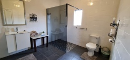 - Bathroom: Large bathroom with walk-in shower, toilet and hand basin.